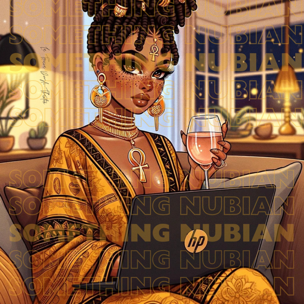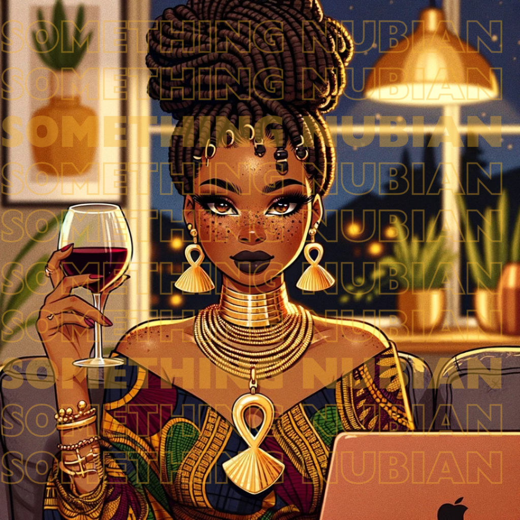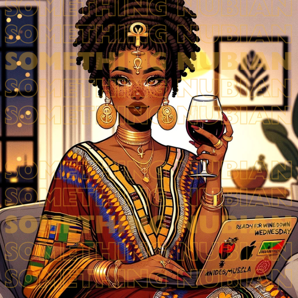 It exudes a warm, inviting atmosphere that encapsulates the essence of Creative Roots’ Wine Down Wednesday—an online social event that stands as a beacon of relaxation and connectivity in a world that often moves too fast. It features a melanated figure radiating confidence and serenity. Adorned with ankh earrings that reflect her cultural pride and spiritual awareness, she raises a glass of wine in a toast, symbolizing camaraderie and the celebration of collective creativity.