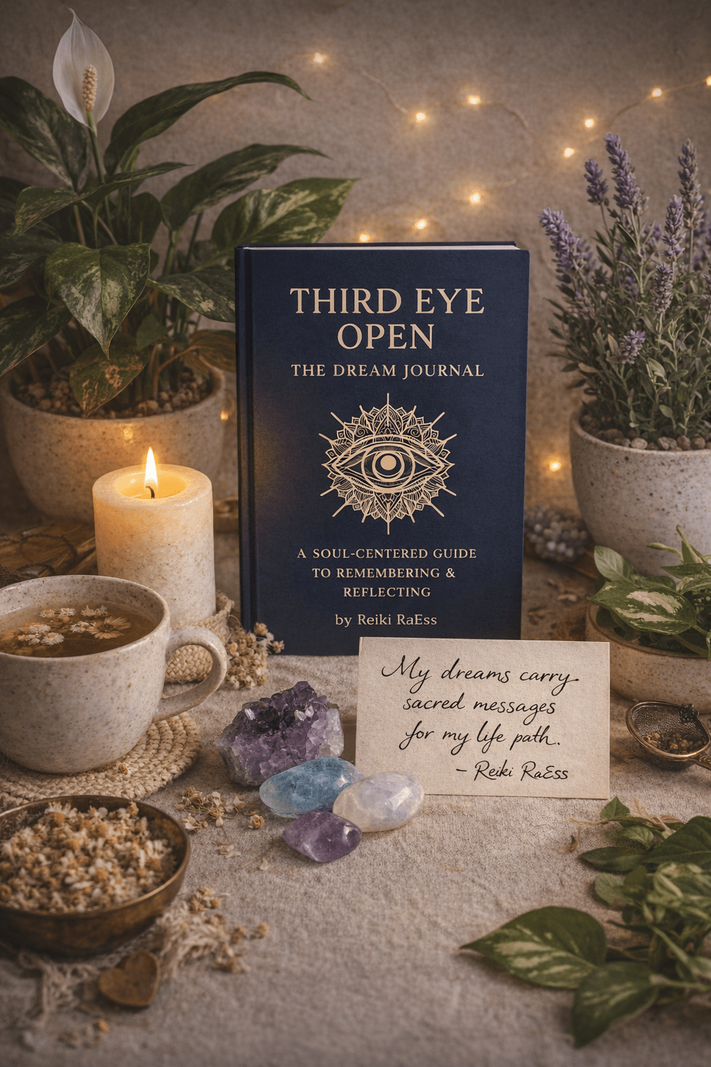 A Pisces New Moon altar for dream reflection — featuring the Third Eye Open Dream Journal by Reiki RaEss.
